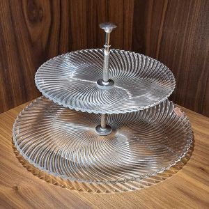 شیرینی خوری ۲ طبقه از کریستال مرغوب ساخته شده و ۲ بشقاب آن، در وسط توسط یک میله محکم به هم متصل شده اند. کاربردی بودن آن در صرفه جویی در فضای روی میز و سهولت جابجایی نهفته است. به راحتی می توانید انواع خوراکیهای مختلف را در طبقات آن قرار دهید: ساندویچ، میوه، دسر و غیره.